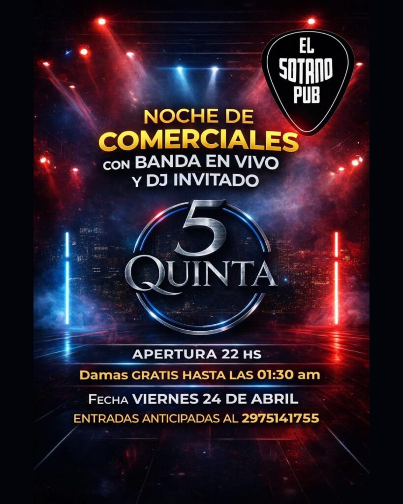 – En El Sótano Pub, después de la medianoche, se presenta Quinta, en una noche repleta de comerciales donde también hay DJ invitado. Las puertas abren a las 22:00 y las mujeres ingresan gratis hasta la 1:30. Anticipadas al 297-5141755.