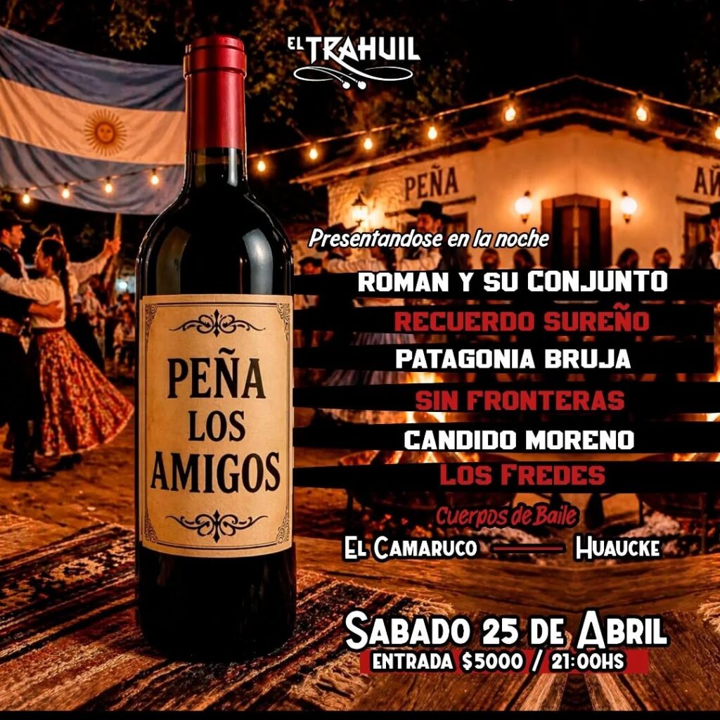 – En El Trahuil, a partir de las 21:00, la “Peña Los Amigos” presenta a Román y su Conjunto, Recuerdo Sureño, Patagonia Bruja, Sin Fronteras, Cándido Moreno y Los Fredes, junto a los cuerpos de baile El Camaruco y Haucke. Entrada: $5.000.
