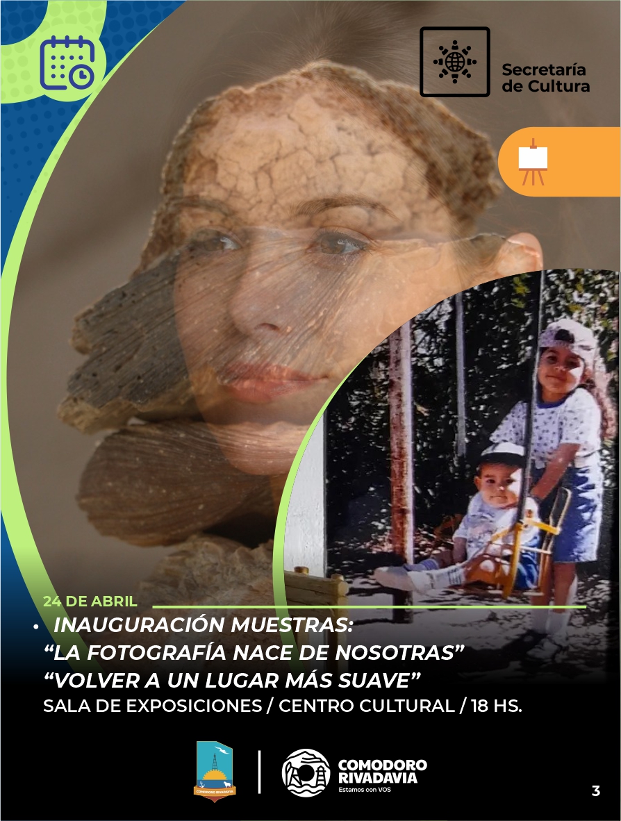 – En la Sala de Exposiciones del Centro Cultural, a partir de las 18:00, se inauguran las muestras “La fotografía nace de nosotras” y “Volver a un lugar más suave”.
