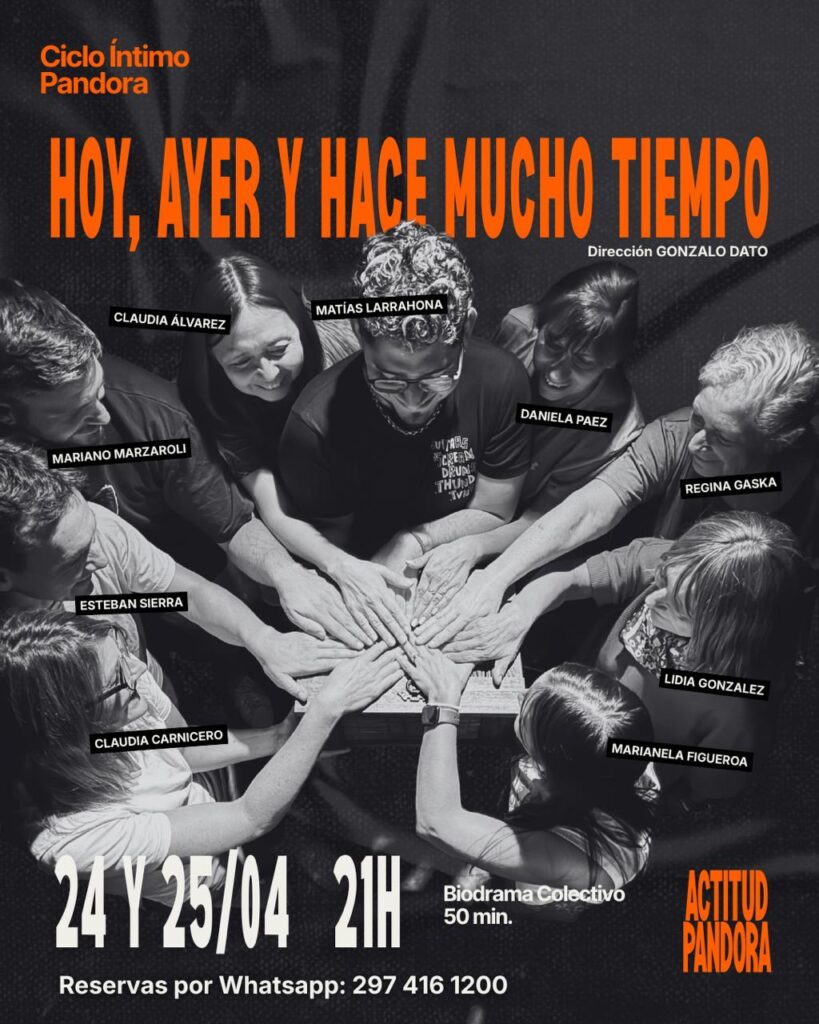 – En Actitud Pandora, a partir de las 21:00, se presenta el biodrama colectivo “Hoy, ayer y hace mucho tiempo”. Reservas por WhatsApp, al 297-4161200.