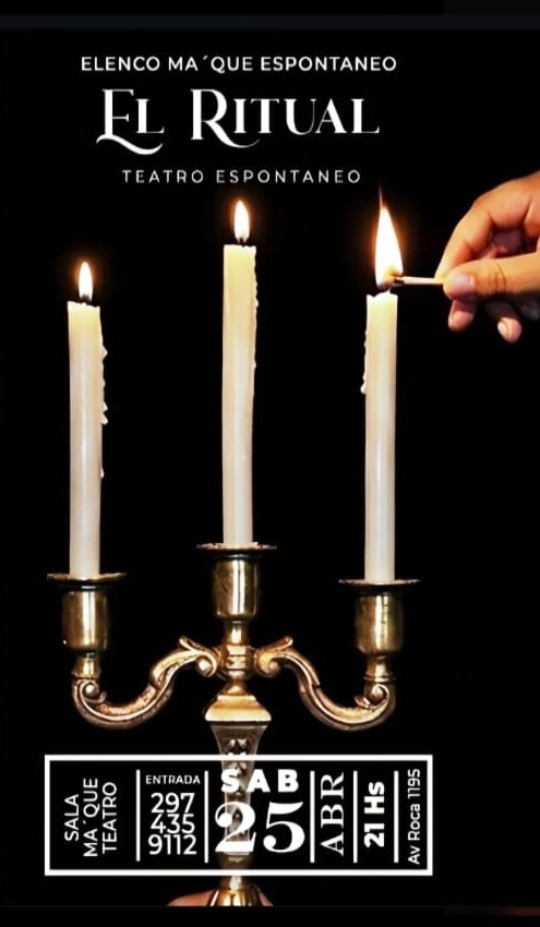 – En Sala Ma’ Que Teatro, a partir de las 21:00, se presenta la obra de teatro espontáneo “El ritual”. Reservas al 297-4359112.