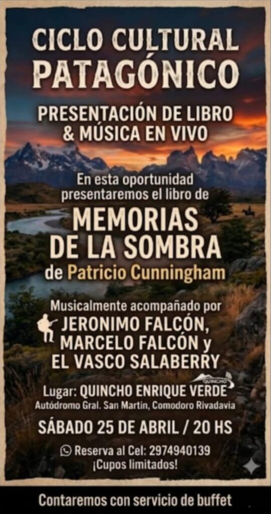 – En el quincho del autódromo General San Martín, desde las 20:00, se realiza el Ciclo Cultural Patagónico, con la presentación del libro “Memorias de la sombra”, de Patricio Cunningham, más el acompañamiento de la música en vivo de Jerónimo Falcón, Marcelo Falcón y “El Vasco” Salaberry. Además, hay servicio de buffet. Reservas al 297-4940139.