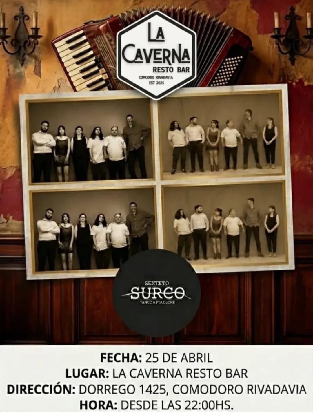 – En La Caverna Resto Bar, a partir de las 22:00, se presenta Sexteto Surco, compuesto por músicos de Comodoro y Rada Tilly, con un recorrido sonoro que dialoga entre el folclore y el tango.