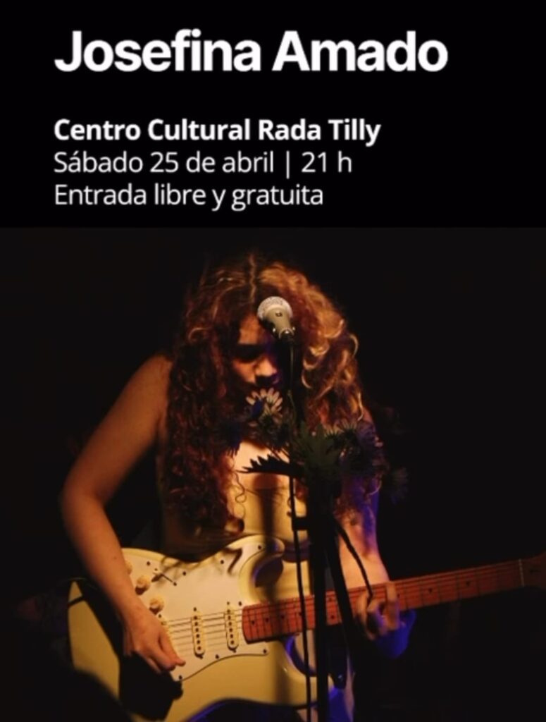– En el Centro Cultural Rada Tilly, desde las 21:00, se presenta Josefina Amado con su propuesta fresca y potente que invita a dejarse llevar por la música en un entorno cercano. La entrada es libre y gratuita.