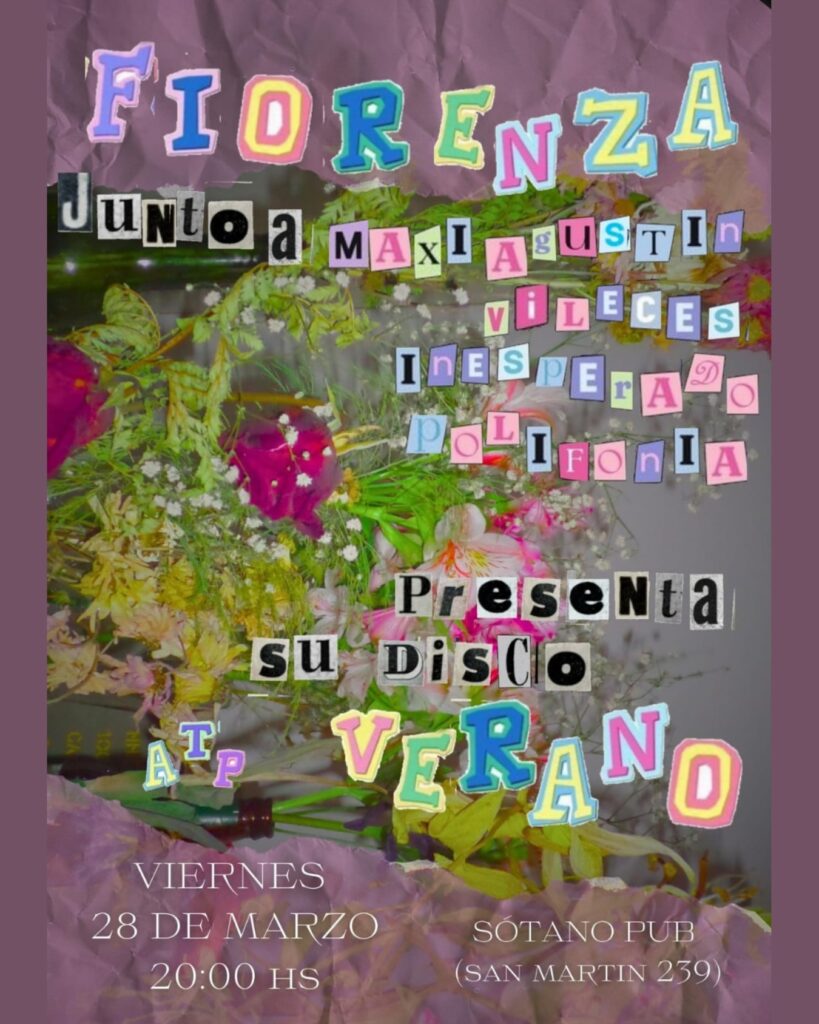 – En El Sótano Pub, Fiorenza presenta su primer disco, “Verano”, junto a Polifonía, Inesperado, Vileces y Maxi Agustín. Puerta y boletería abren a las 20:00 y el show arranca puntual a las 21:00.