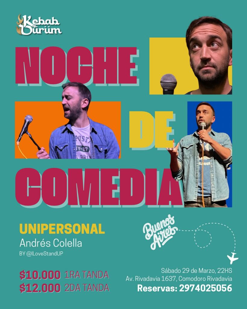 – En Kebab Dürüm de la calle Rivadavia, hay noche de comedia con el show unipersonal de Andrés Colella. Arranca a las 22:00 y las entradas son por reserva al 2974025056: $10.000 la primera tanda y $12.000 la segunda tanda.