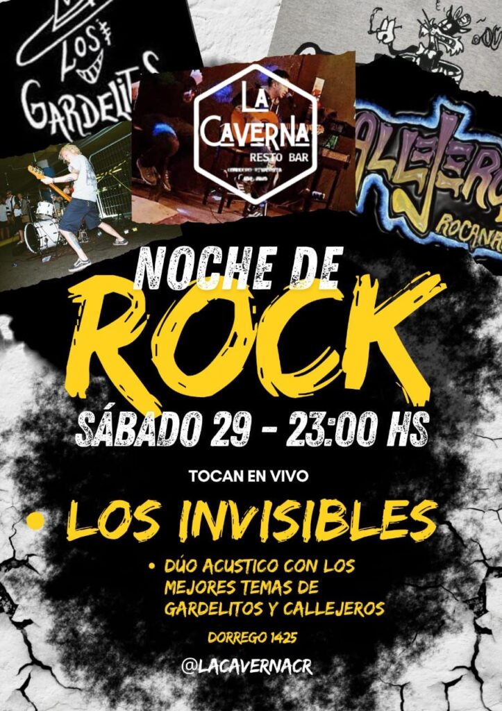 – En La Caverna Resto-Bar, desde las 23:00, se presenta el dúo Los Invisibles, con los mejores temas de Gardelitos y Callejeros.