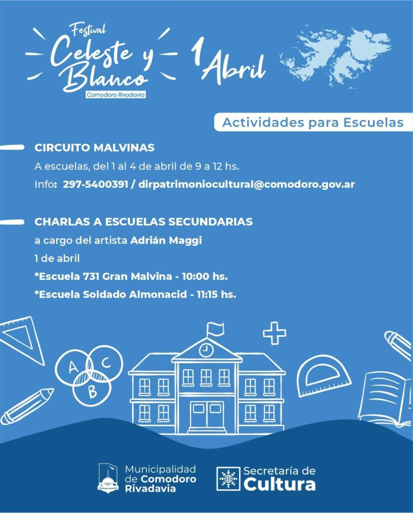 – En el Centro Cultural se realizará el Festival Celeste y Blanco, en homenaje a los veteranos y caídos en Malvinas, con las presentaciones del Ballet Mi Patagonia, Grupo Nuevo Reencuentro, Diego Rey, Kevin Gallegos, Rafael Quipildor, Emanuel, Ballet El Trébol, Canto Diadema y Adrián Maggi, quien además brindará charlas en la Escuela 731 Gran Malvina (a las 10:00) y en la Escuela Soldado Almonacid (a las 11:15). Por la noche tendrá lugar la tradicional Guardia de las Estrellas, en el paseo costero. También se desarrollará el “Circuito Malvinas” con charlas educativas para escuelas, hasta el 4 de abril, de 9:00 a 12:00. Por otro lado, habrá muestras, proyecciones y mural colaborativo, mientras que en el exterior del CEPTur habrá muestra de artesanos y diseñadores.