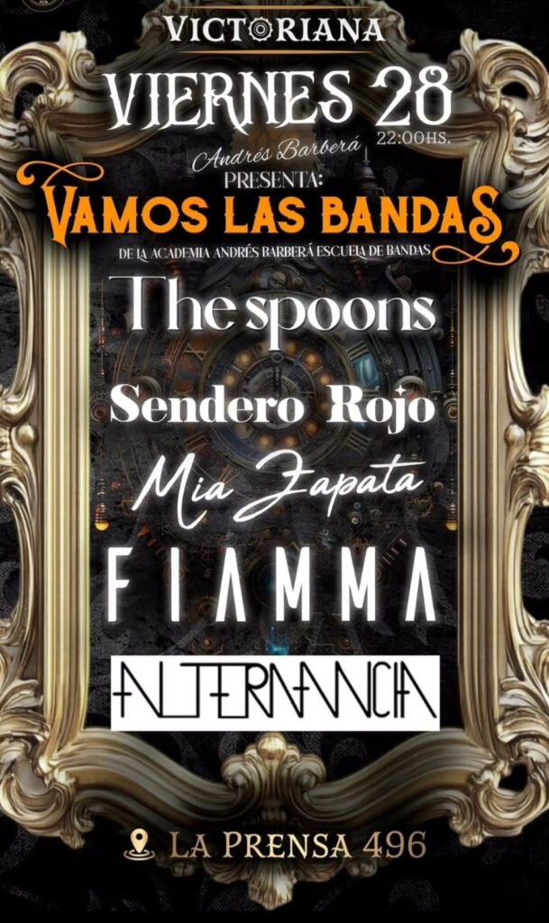 – En Victoriana Pub, desde las 22:00, la Academia Andrés Barberá pone en escena el festival “Vamos las Bandas”, con las presentaciones de The Spoons, Sendero Rojo, Mía Zapata, Fiamma y Alternancia.