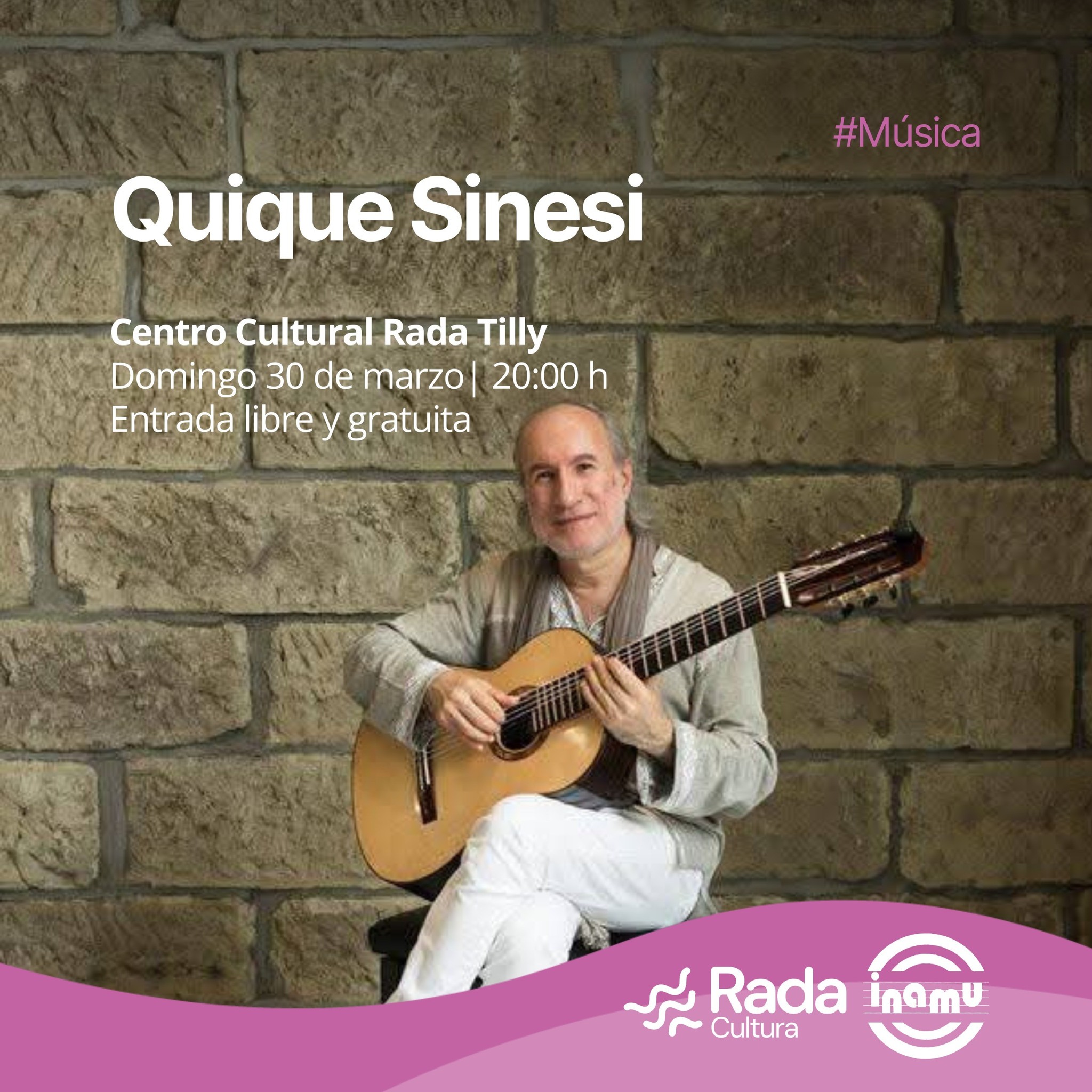 – En el Centro Cultural Rada Tilly, desde las 20:00 y con el auspicio de INAMU, se presenta el guitarrista y compositor Quique Sinesi, reconocido mundialmente por su virtuosismo en la guitarra española y su extenso repertorio que abarca el folklore del Río de la Plata, tango, jazz y clásico contemporáneo. La entrada es libre y gratuita.