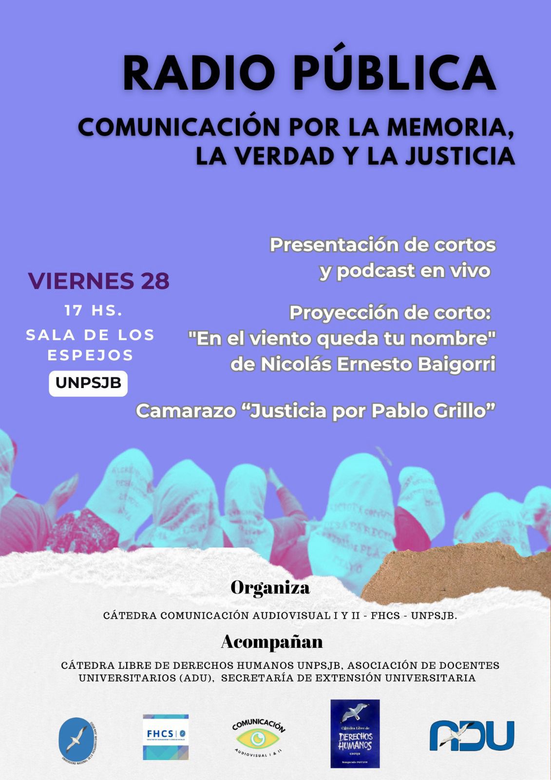 – En la Sala de los espejos de la Universidad, desde las 17:00, se realiza el encuentro “Radio Pública: Comunicación por la Memoria, la Verdad y la Justicia”. Habrá una presentación de cortos y podcast en vivo, sumado a una proyección del cortometraje “En el viento queda tu nombre”, de Nicolás Ernesto Baigorri, seguido del Camarazo “Justicia por Pablo Grillo”.