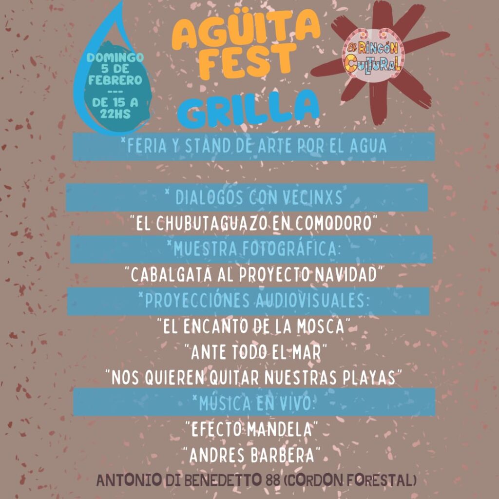 Se realizará este domingo desde las 15:00 el “Agüita Fest” en El Rincón Cultural. A poco más de un año del “Chubutazo” que frenó la megaminería en toda la provincia, Comodoro Rivadavia, ciudad petrolera y extractiva por excelencia, y con crónicos problemas de abastecimiento de agua para la población, también escribió sus importantes páginas en esta historia de lucha, lo cual sigue ameritando una narración y un festejo.