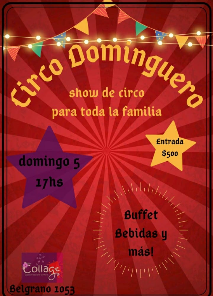 – Circo Dominguero en Collage (Belgrano 1053). Show para toda la familia, con buffet, bebidas y más, desde las 17:00 hs. Entrada: $500.