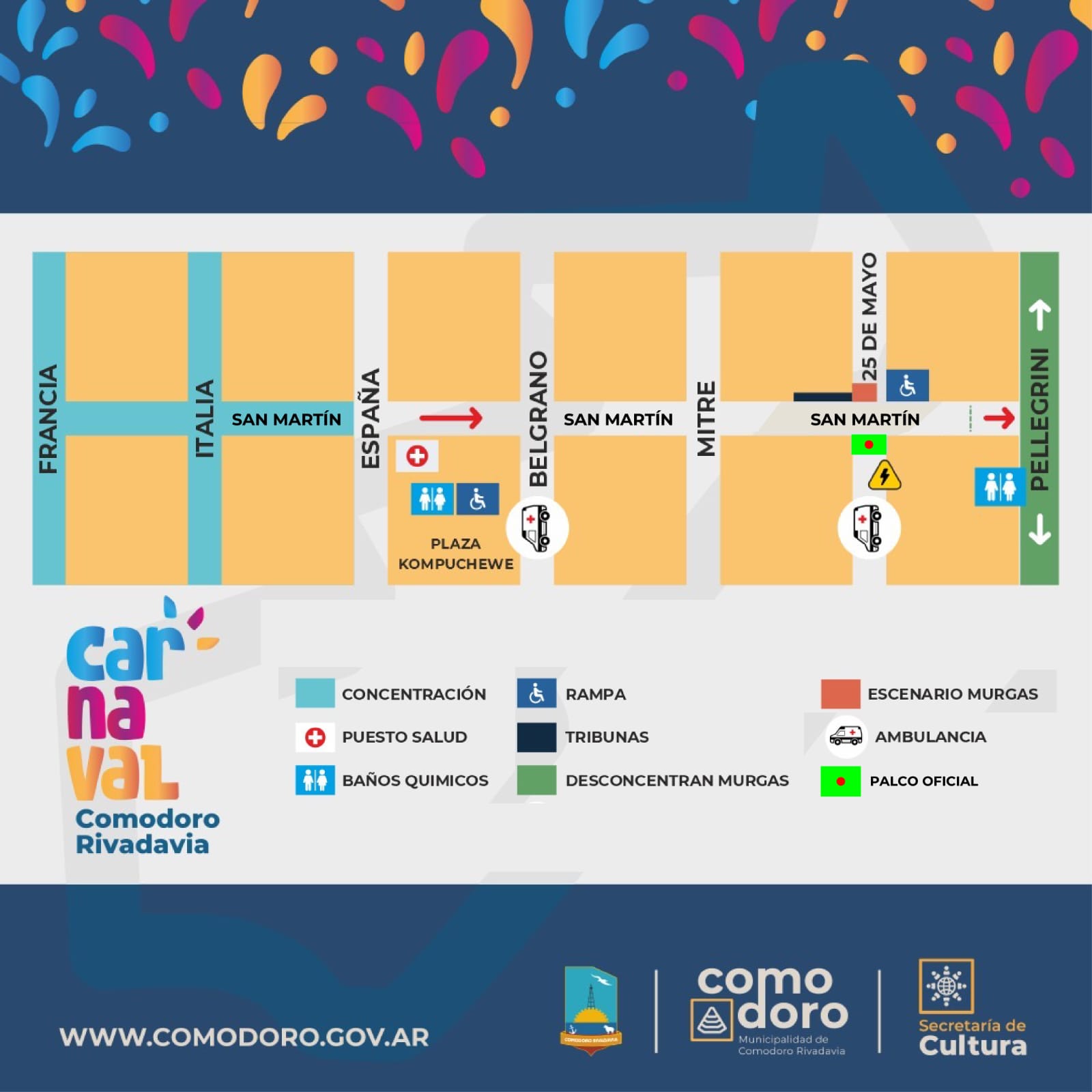 Asimismo, habrá dos ambulancias apostadas sobre las calles Belgrano y calle 25 de Mayo, mientras que se ubicará un puesto sanitario, a cargo de la Secretaría de Salud, en la plaza de la Escuela 83. Además, se dispondrá de baños químicos para el público en el mencionado espacio y sobre calle Pellegrini.