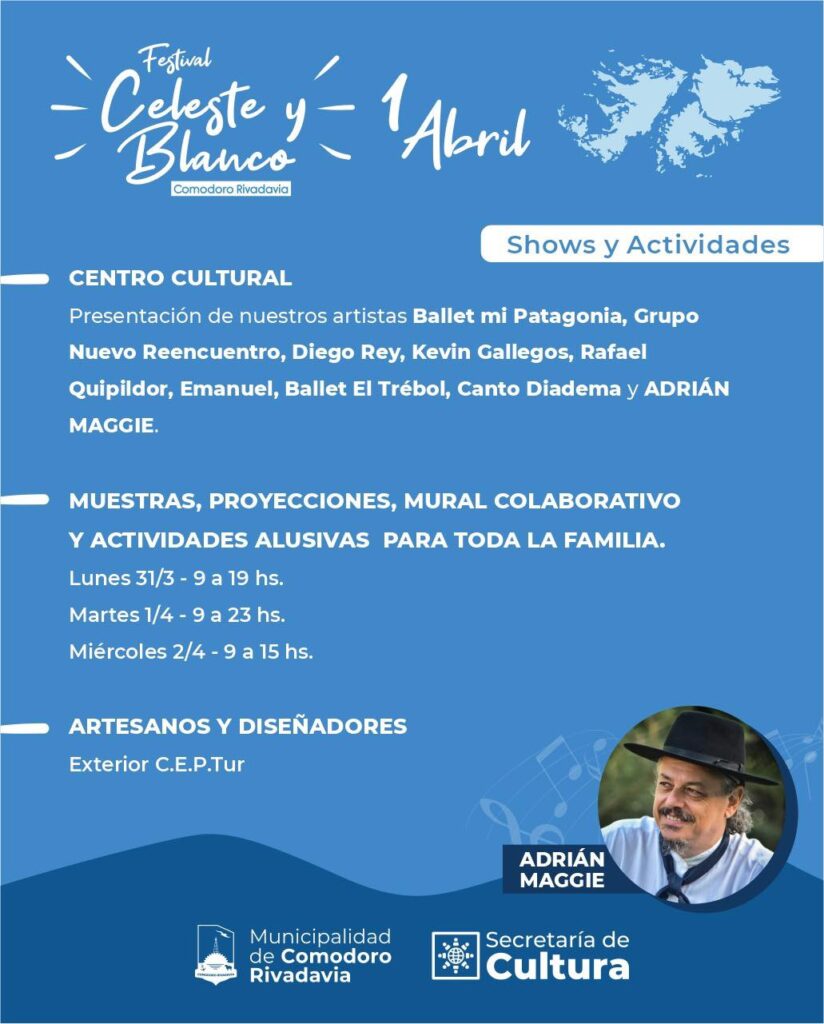 Un evento cargado de historia, cultura y emoción para recordar a nuestros héroes y reafirmar nuestro compromiso con la soberanía, se realizará este martes el Festival Celeste y Blanco en el Centro Cultural, desde las 19:00 hasta las 23:00.