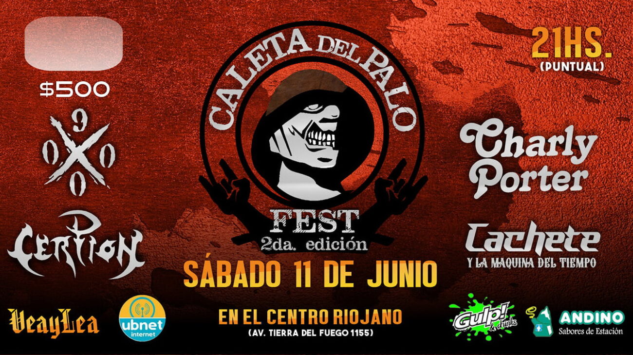 – Caleta Del Palo Fest (2ª edición) en el Centro de Residentes Riojanos de Caleta Olivia (avenida Tierra del Fuego 1048) desde las 21:00 hs. Grilla: Cachete y La Máquina Del Tiempo (C.O.), The Charly Porter (C.O.), 9000 (C.R.) y Cerpión (P.T.). Valor: $500.